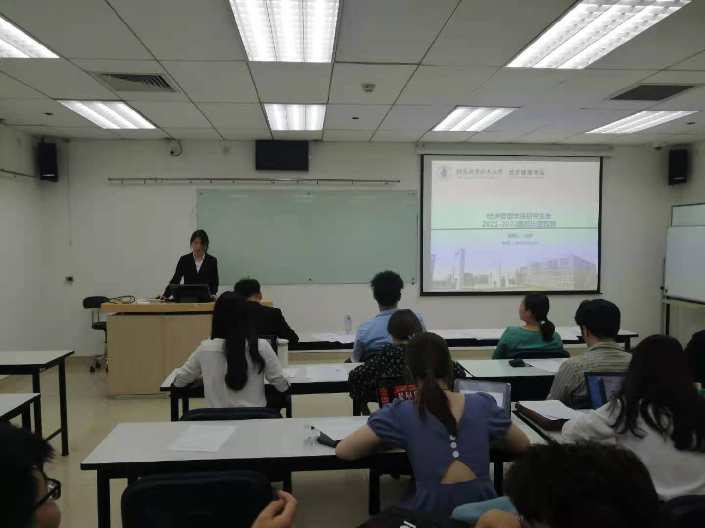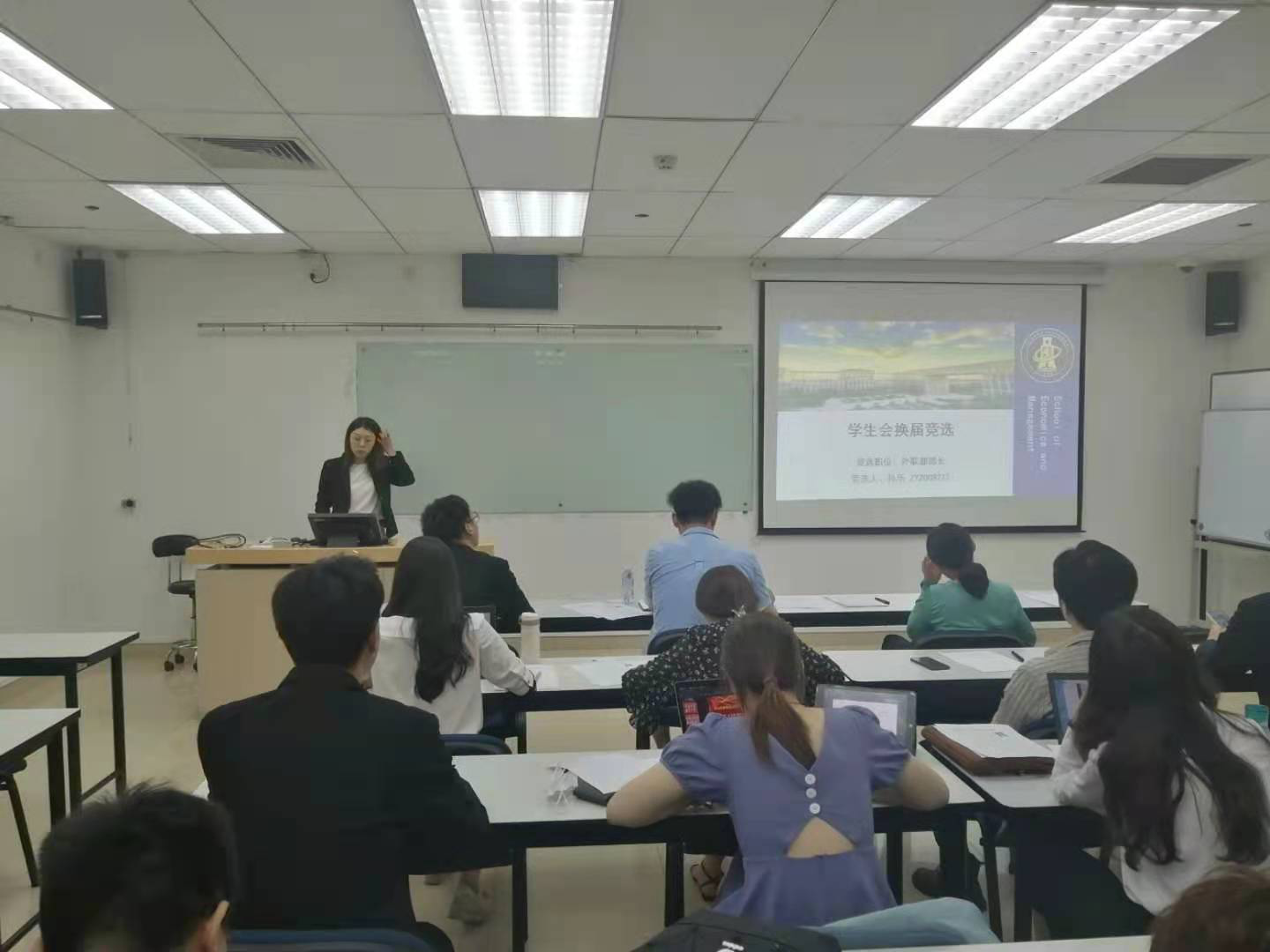 6月17日晚,北京欧美大片ppt免费大全经济管理学院研究生会换届大会在新主楼A1048教室召开。经济管理学院学生工作办公室主任衣萌老师、2019级硕士研究生辅导员刘东岳以及2020届经管研究生会主席团、部长团5人出席了会议。会议由2021届研会执行主席彭宇飞主持。
