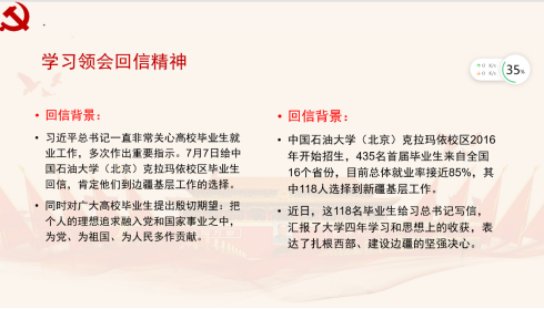 首先,会议第一部分内容为学习习近平总书记给中国石油大学(北京)克拉玛依校区毕业生的回信,包括这封回信的背景介绍,回信的内容,以及回信每个章节的内容分析。
