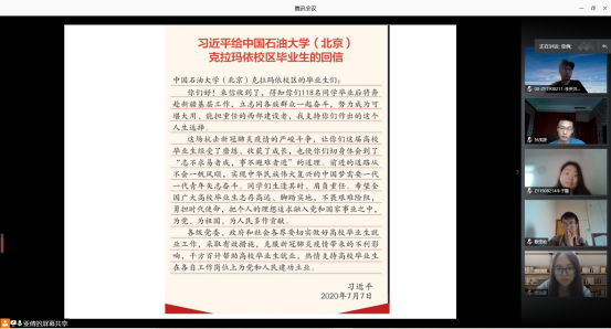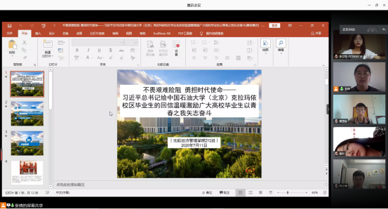2020年7月11日上午十点,经济管理学院工业工程ZY2班在腾讯会议(会议号:257 214 775)召开班级学习会,集中学习习近平总书记给中国石油大学(北京)克拉玛依校区毕业生的回信,全体班级成员参加会议,班长佘亚倩主持会议。
