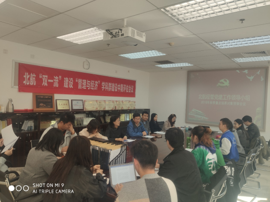 2019年10月25日上午,北航经管学院学生党建工作领导小组在新主楼A710举行会议,参加此次会议的有学生党建工作领导小组组长研究生指导主任单伟、关工委副会长高志红、研工办主任衣萌、北京学院办公室主任吴衍川、本科专职辅导员白雪、专职辅导员张慧美、各年级辅导员以及各学生党支部书记。会议由单伟老师主持,主要对新一批学生重点培养对象进行审核和讨论。
