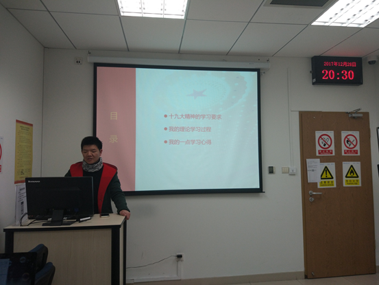 2017年12月28日,北航经济管理学院1408第一党支部邀请北航研究生宣讲团的学长为支部同学进行了关于学习十九大精神的宣讲。17级能源与动力学院研究生支部的支部书记王子贤同志宣讲的主题为《学十九大报告,做新时代标兵》。