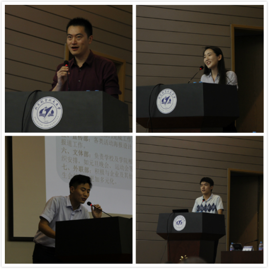 会后,我院学生工作办公室主任衣萌老师为大家做新生入学教育,介绍了有关经管学院机构部门和党政的相关工作。我院研究生会主席邹野同学、“经英荟”王旭琦同学、志愿者协会石宇涵同学和MBA联合会副会长张骁同学分别进行了招新宣讲,全体新生聆听了宣讲,经济管理学院2017级研究生开学典礼圆满落幕。
