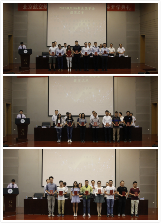 颁奖环节结束后,由新生代表进行发言。MBA新生代表赵洢瑶同学发言,她认为工作后重新回到学习中,使她感到充满了仪式感,不忘初心,坚守梦想,要敢于去追求卓越。研究生新生代表毕艺苇同学认为学习是基础,工作是实践,在接下来的时间中,要努力学习,做一个知行合一的北航人,要戒骄戒躁,仰望星空,脚踏实地。在校研究生代表夏棒同学代表全体研究生对2017届学弟学妹表示热烈欢迎,希望新生可以和北航一起成长,要明白自己喜欢什么,不能随波逐流,不甘于平庸,认认真真做事,踏踏实实做人,必不会被生活辜负。