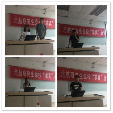 首先由衣老师为大家介绍了此次活动的实践主题、开展形式、答辩会的评分细则等内容。接下来,遍及15个学院的48名本期学员,共分为7个小组进行了汇报。各小组分别结合“两学一做”为主题开展了丰富多彩的课外实践和小组讨论活动。如材料学院与工程学院小组的同学,从人民的名义谈了怎样做好一个党员,以及对党课的心得。能源动力、计算机学院和大飞机班的小组,一起参观了国家博物馆,并结合前三次党课的学习心得感受作出了总结汇报。经管学院小组组织了“四讲四有”知识竞赛,全面检测下组成员的学习成果。交通、可靠性、空间及宇航学院小组将学习“四讲四有”做合格党员的成果进行了汇报。仪器光电及软件学院小组在“两学一做”学习教育中重点讲解了“为什么要坚定理想信念”,并在最后总结到“古之立大事者,不惟有超世之才,亦必有坚忍不拔之志”。法学院小组派出代表重温什么是“两学一做”学习教育。最后,中法工程师、化学及马克思学院小组学习了习近平总书记系列重要讲话,并在汇报中总结出当代大学生的使命与责任“努力学习、积极进取,以无愧于党和国家为我们创造的和平年代,在所学领域努力钻研、积极创新,为实现中华民族的伟大复兴做贡献。”