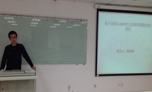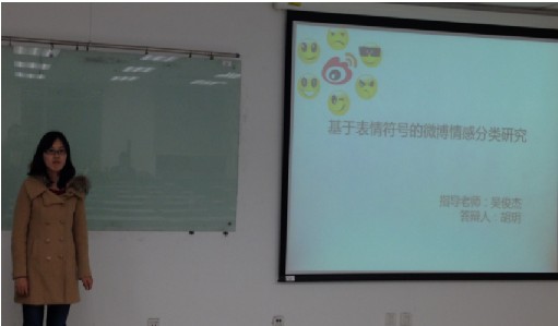 首先上台宣讲的是金融工程专业的陈彬彬,他的题目是《基于改进J——LSSVR方法的利率期限结构研究》,文章在LSSVR方法的基础上,通过增加3个索引集合,根据一定的选择和停机标准确定支持向量,提出了改进的J-LSSVR方法并发现拟合国债期限结构方面运算时间更优。而后上场的马婧是2012年级第一名,会计专业,她的题目是《作业成本法在航空制造业成本核算中的应用研究》,她的文章发现作业成本法可以还原产品的真实成本,克服传统成本法下的信息失真和成本扭曲,为管理者科学决策提供重要依据。最后给大家讲解的是来自信管的胡玥,她极其吸引人眼球的题目《基于表情符号的微博情感分类研究》使用微博数据来获取民众的情绪态势,并可以对情绪波动进行解释;其次利用半监督学习算法,将表情符号映射到各情感类别中,提高了分类精度和稳定性;最后利用LIBLINEAR算法,针对类不均衡问题进行了大量实验,建立了一个快速、准确的分类模型,为下一步的应用设计奠定了基础。