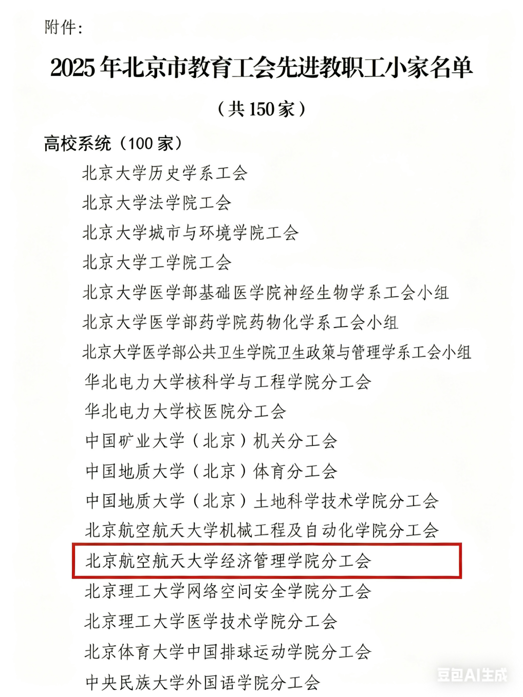 从初建到成熟,从服务到引领,北航经管学院工会小家始终是教职工的心灵驿站与成长的平台:这里有学术交流的思想碰撞,有困难帮扶的温情暖意,更有集体活动的欢声笑语。此次获评北京市先进教职工小家,既是荣誉更是动力。聚力创新筑小家,温情服务为大家。学院工会将继续秉承“温情服务、共建共享”的核心理念,以更高标准、更实举措深化“小家”建设,为教职工办实事、解难题,持续凝聚起建设世界一流经管学院的智慧与力量。