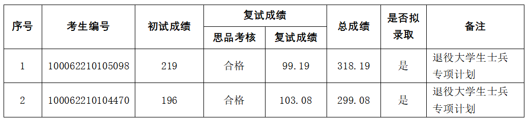 由于退役大学生士兵专项计划考生不享受加分政策,现将2022年3月29日公示的复试结果(http://mba.dienj.com/info/1014/6135.htm)中两名退役大学生士兵专项计划考生的复试结果更正如下: