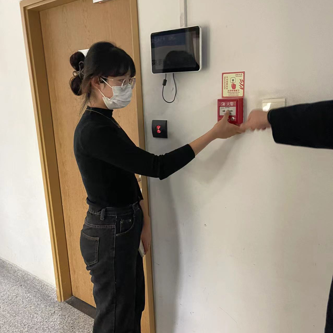 此次消防演练的报警员李宜荣模拟发现A721实验室有火情后,第一时间按动楼道手报按钮,同时拿起电话拨打物业中控室电话“82339090”报警:“新主楼A座721实验室发生火情,火势较大,请速来扑救。”