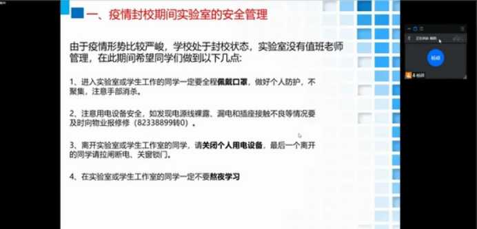 经济管理学院实验中心于2022年6月2日上午组织实验中心有注册机位的同学参加线上消防安全培训(1学时课程),本次培训课由杨硕老师主讲。主要培训内容为实验室火灾案例分析、疫情封校期间实验室安全管理注意事项、危险源的辨识方法、相关消防设施介绍、灭火器使用方法、如何正确拨打电话报告火警、实验室安全准入管理要求等。讲解中,杨硕老师特别强调了封校期间实验室的安全管理、灭火器的使用方法和实验室安全准入管理等重点事项。