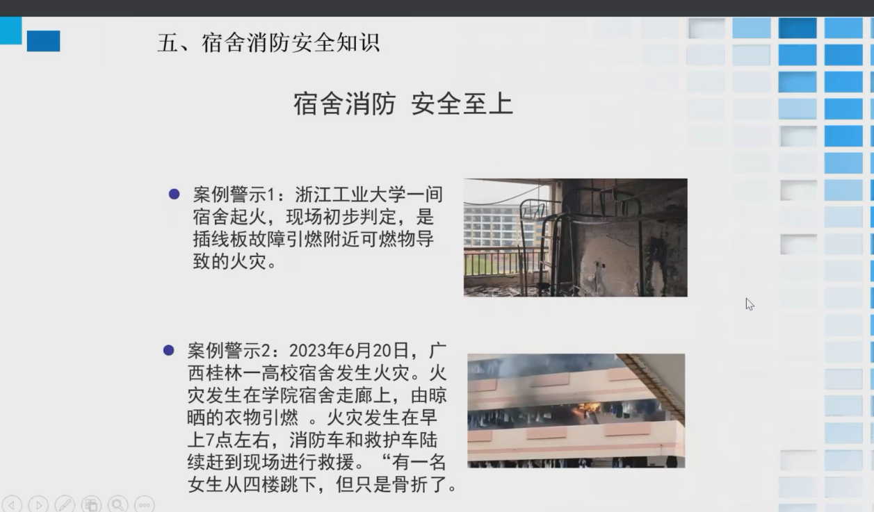 为进一步巩固师生消防安全意识及培养安全习惯,培育紧急逃生自护自救的能力,共建安全、稳定、和谐的校园环境,本着“安全第一,预防为主”和“以人为本”的理念,学院于2024年5月7日上午10点,通过在线腾讯会议形式为全院师生进行安全教育培训,此次培训由实验中心副主任曹明老师主讲。