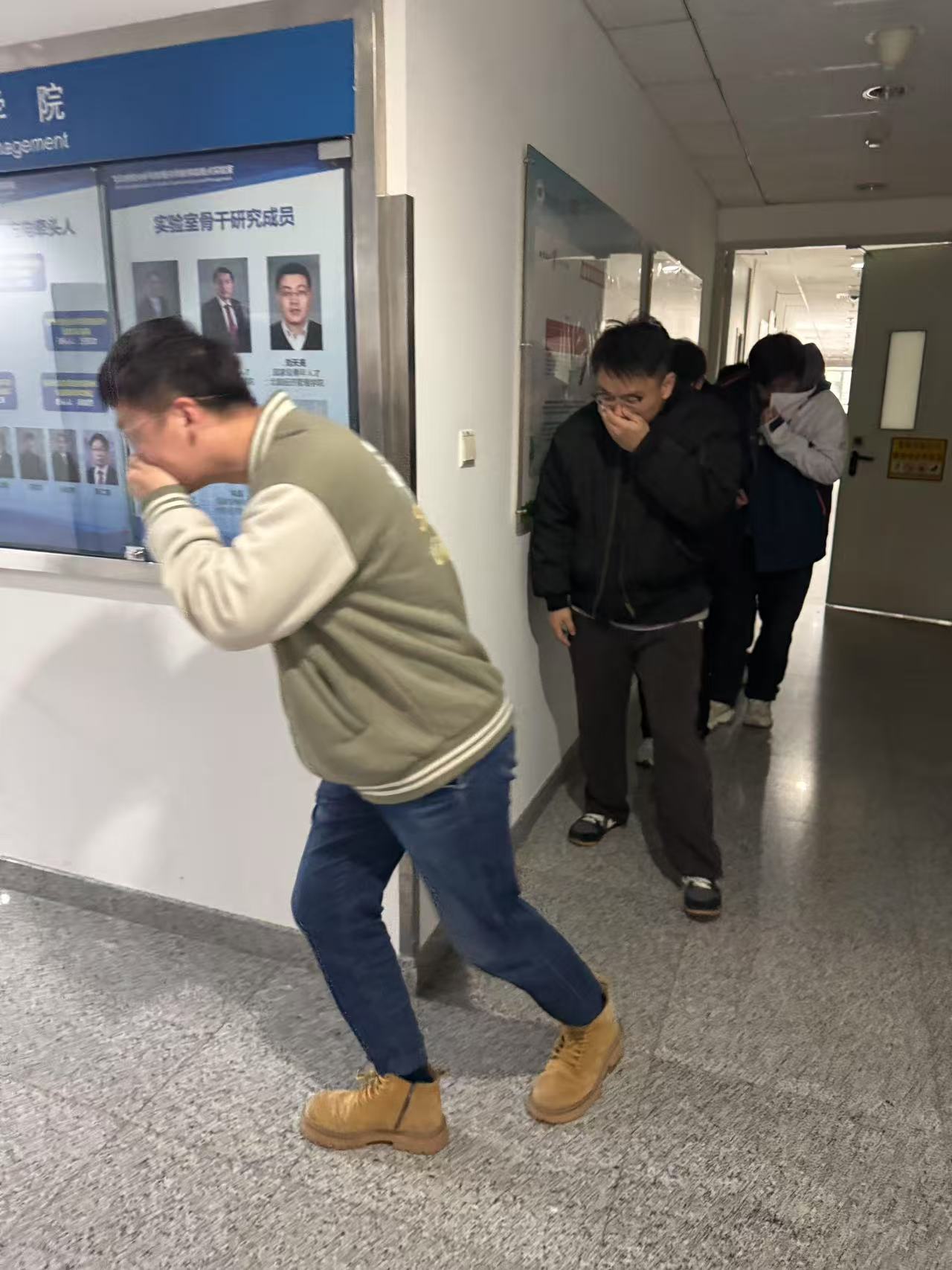 疏散组老师向各实验室房间喊话通知:“各位师生,A701房间发生火警,请大家保持镇静,按疏散线路有秩序地进行疏散,逃生时要注意用湿毛巾(湿手帕)捂住口鼻,弯着腰撤离火灾现场,往新主楼楼下紧急疏散。”同时为各实验室断电,避免火情蔓延,并关闭通道中的隔火门,预防火势蔓延。